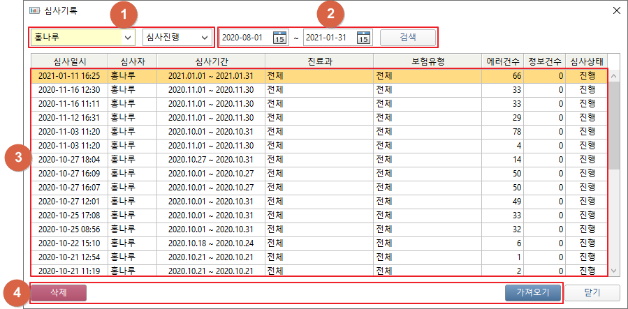 ① 진료의/신사진행 콤보박스 선택값을 변경하여 심사기록을 조회할 수 있습니다. 콤보박스 변경 시 즉시 검색됩니다. ② 기간을 선택하여 해당기간에 심사된 심사기록을 조회할 수 있습니다. 기간 선택 후 [검색] 버튼 클릭 시 검색됩니다. ③ 검색된 심사기록이 표시됩니다. 조회된 심사기록을 더블클릭하여 심사기록을 불러올 수 있습니다. ④ [삭제] 버튼 클릭 시 목록에 선택되어있는 심사기록이 삭제됩니다. [가져오기] 버튼 클릭 시 목록에서 선택된 심사기록을 불러올 수 있습니다. 1. 심사 화면