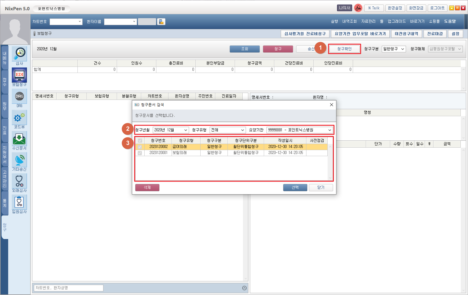 ① [청구확인] 버튼을 클릭합니다. ② 청구문서 검색조건을 선택할 수 있습니다. ③ 작성된 청구문서 목록을 확인합니다. 1. 청구문서 목록
