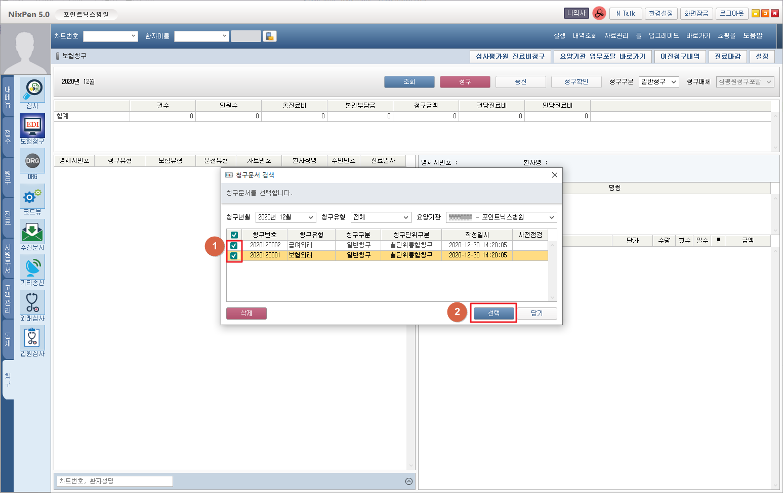 ① 확인하고자 하는 청구문서를 체크하여 선택합니다. ② [선택] 버튼을 클릭합니다. 2. 청구문서 확인