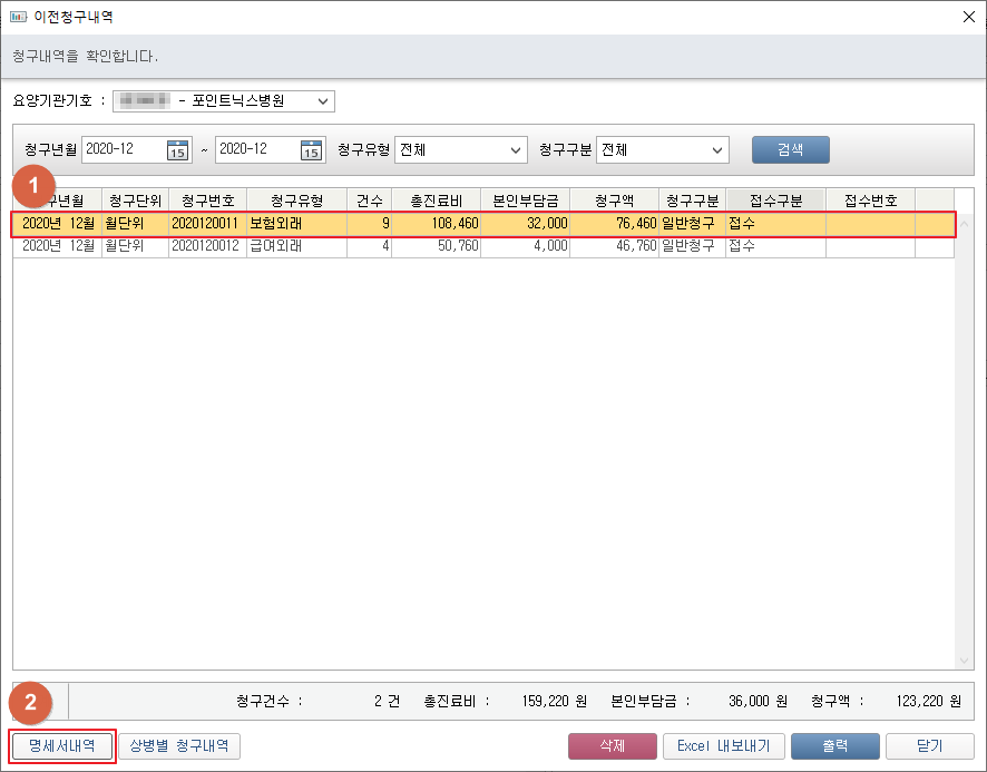 ① 상병별 청구내역을 확인할 청구내역을 선택합니다.