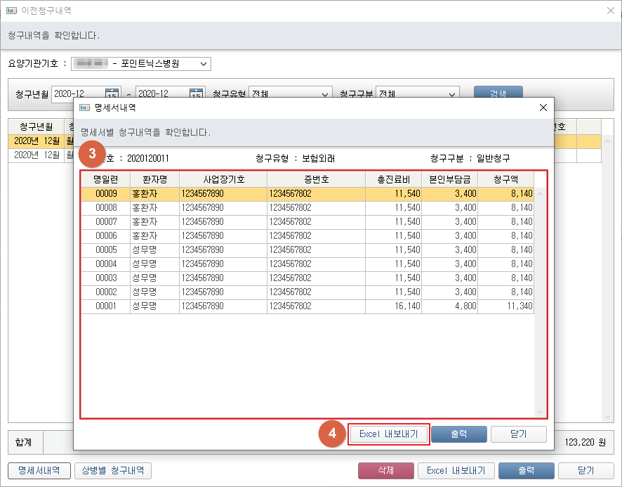 ] 버튼을 클릭하여 진료내역을 엑셀 형식으로 저장합니다.