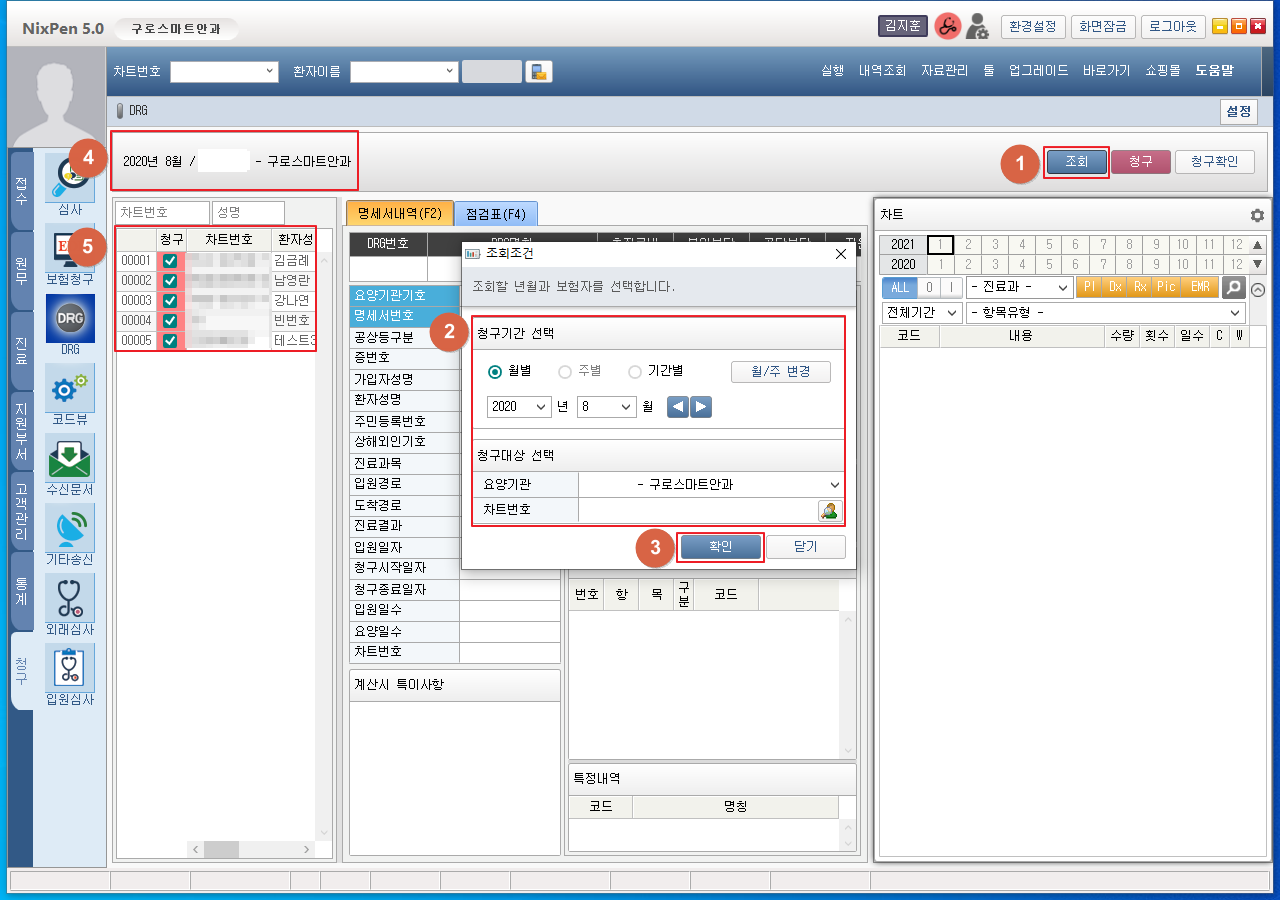 1. 청구대상 조회 ① [조회] 버튼을 클릭합니다. ② 청구기간과 청구대상을 선택합니다. ③ [확인] 버튼을 클릭합니다. ④ 검색 조건이 표시됩니다. ⑤ 검색된 DRG 청구 대상을 표시합니다.
