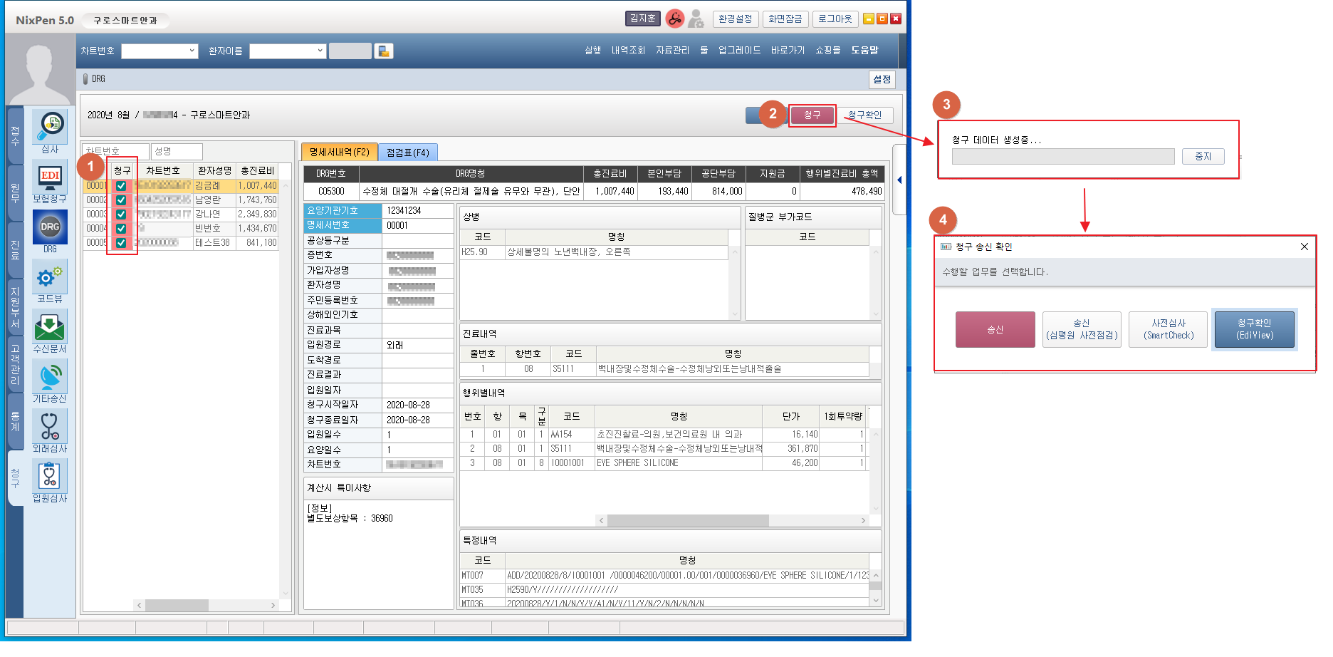 ① 청구를 진행할 목록을 선택해 줍니다. ② [청구] 버튼을 클릭합니다. ③ 청구를 진행합니다. 데이터 생성중에는 [중지] 버튼을 클릭하여 중지할 수 있습니다. 청구 진행 현황을 확인할 수 있습니다. ④ 청구 진행 완료시 청구 송신 확인 창이 팝업합니다. [송신] 버튼 클릭 시 청구 내역을 송신 할 수 있습니다. [송신(심평원 사전점검)] 버튼 클릭 시 송신 및 심평원 사전점검을 진행할 수 있습니다. [사전점검(SmartCheck)] 버튼 클릭 시 사전점검을 진행할 수 있습니다. [청구확인(EdiView)] 버튼 클릭 시 청구 진행 내역을 확인 할 수 있습니다. 1. 보험청구