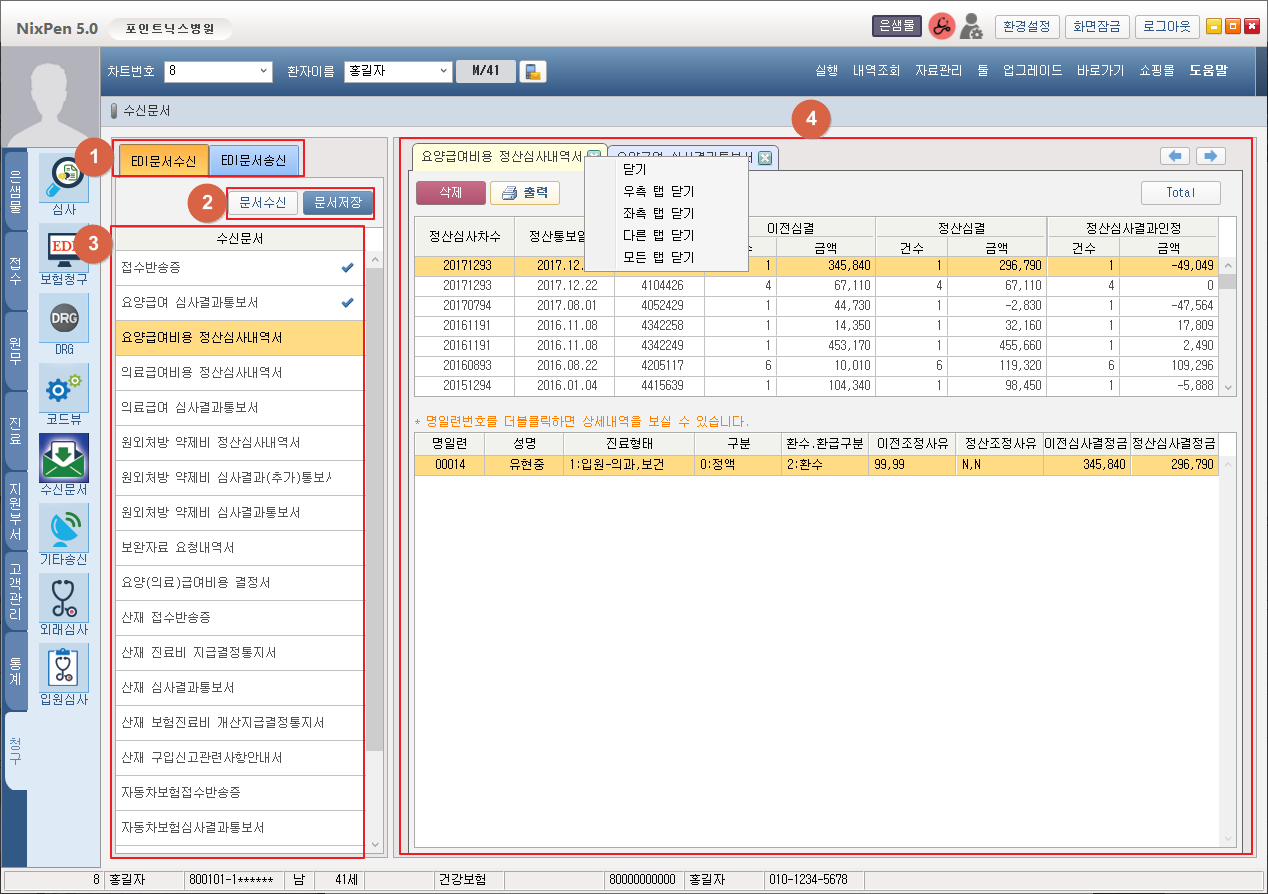 ① 문서 수신 / 문서 송신 탭을 선택할 수 있습니다. 문서 수신 탭에 접근하기 위해서는 수신문서 권한이 필요합니다. 문서 송신 탭에 접근하기 위해서는 기타송신 권한이 필요합니다. ② [문서수신] 버튼 클릭 시 심평원의 통보서 수신 창과 연결됩니다. [문서저장] 버튼 클릭 시 수신받은 문서를 저장합니다. ③ 수신문서 목록이 표시됩니다. 더블클릭 시 ④ 영역에 탭이 열리거나 선택됩니다. 저장된 문서가 존재하는 경우 목록에 파란 체크가 표시됩니다. ④ 선택된 수신문서를 탭으로 표시합니다. [ 1. 수신문서 ] / [