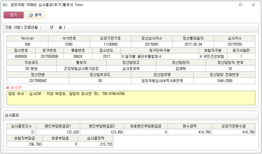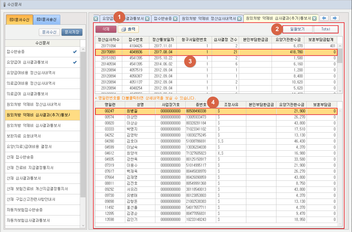 ① 선택된 수신문서를 화면에 표시합니다. ② [일괄보기] 버튼 클릭 시 일괄보기 창이 팝업됩니다. 리스트를 출력하거나 이의신청서를 작성할 수 있습니다. [Total] 버튼 클릭 시 ③에서 선택된 항목의 Total 창이 팝업됩니다. ③ 선택 시 ④ 영역에 목록이 표시됩니다. 더블클릭 시 선택된 항목의 Total 창이 팝업됩니다. ④ 더블클릭 시 상세 창이 팝업됩니다. [ 1. 문서수신 ] / [