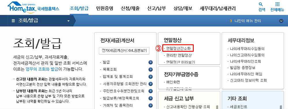 2) 「① 로그인」을 선택하여 제출할 기관의 ID로 로그인 후 「② 조회/발급」선택, 「③ 연말정산간소화」선택
