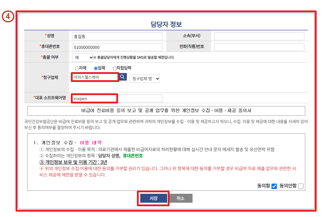 - 담당자 정보 입력 후 저장