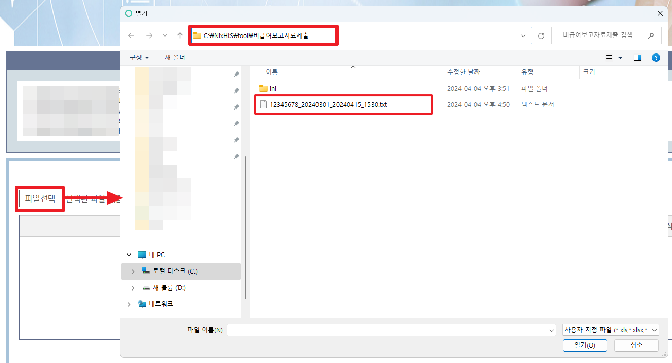 ※ 예) C:\NixHIS\tool\비급여보고자료제출\12345678_20240301_20240415_1530.txt