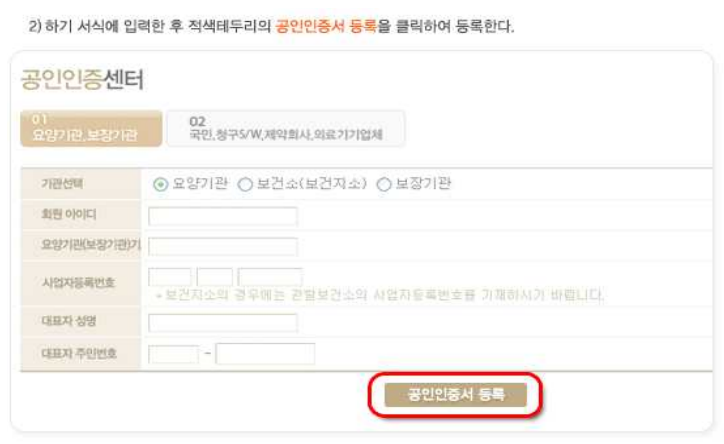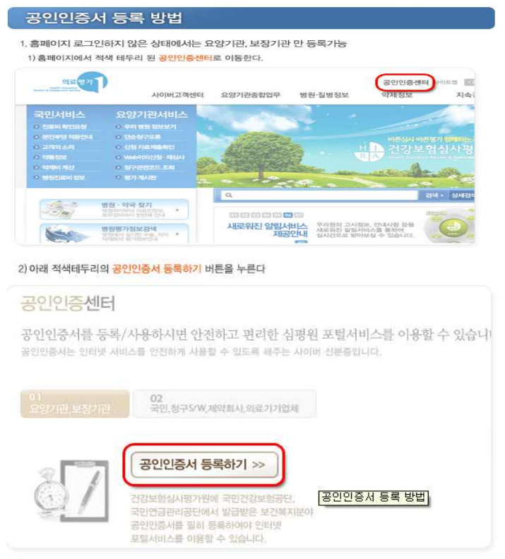 ❍ 기존에 발급받은인증서가 없는 경우, 국민건강보험공단이나 국민연금관리공단에서 공인인증서를 신청하여 발급받은 후에 심평원 홈페이지 공인인증센터에 등록 을 해야 합니다. 심평원에서는 공인인증서 신규발급 기능은 없습니다.