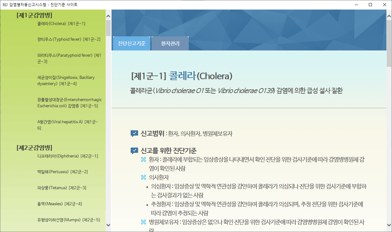✔ 법정감염병 진단기준 웹페이지 보기✎ 법정감염병코드를 기준으로 진단신고기준, 환자관리 정보등을 확인할 수 있습니다.