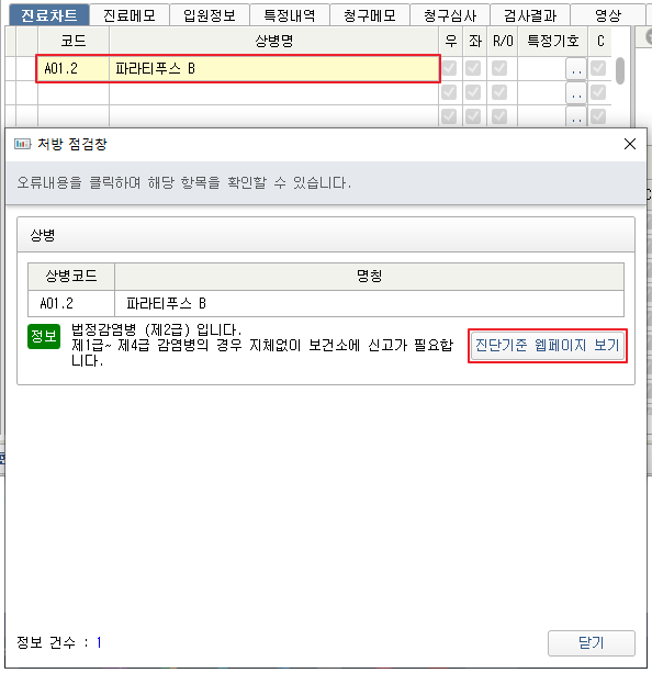 ✎ 차트에서 법정감염병코드 사용 시 경고팝업에서 ‘진단기준 웹페이지 보기’로 확인 가능