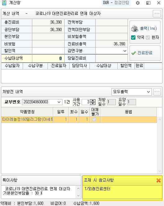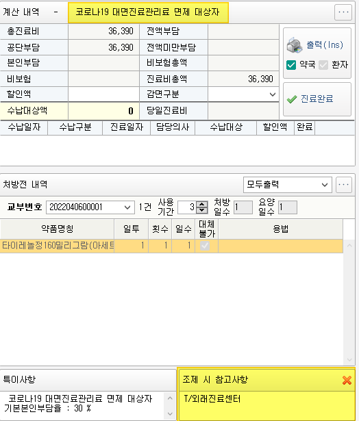 - 코로나19 대면진료 관리료 면제 대상 - 코로나 타질환으로 대면진료관리료 사용시 조제시 참고사항에 수록되지 않음 |