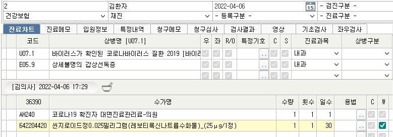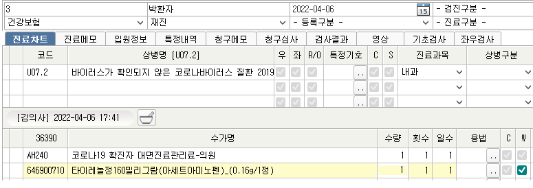 1) AH240 ‘(코로나19 확진자 대면진료관리료-의원)’ 수가 입력 2) 코로나 치료 관련약 처방3) 차트 저장 4) 차트추가 5) 타질환약 처방6) 차트 저장