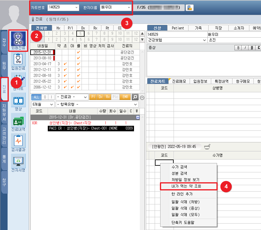 ④ 처방 창 [코드] 영역 우클릭 후 [내가 먹는 약 조회] 메뉴 선택