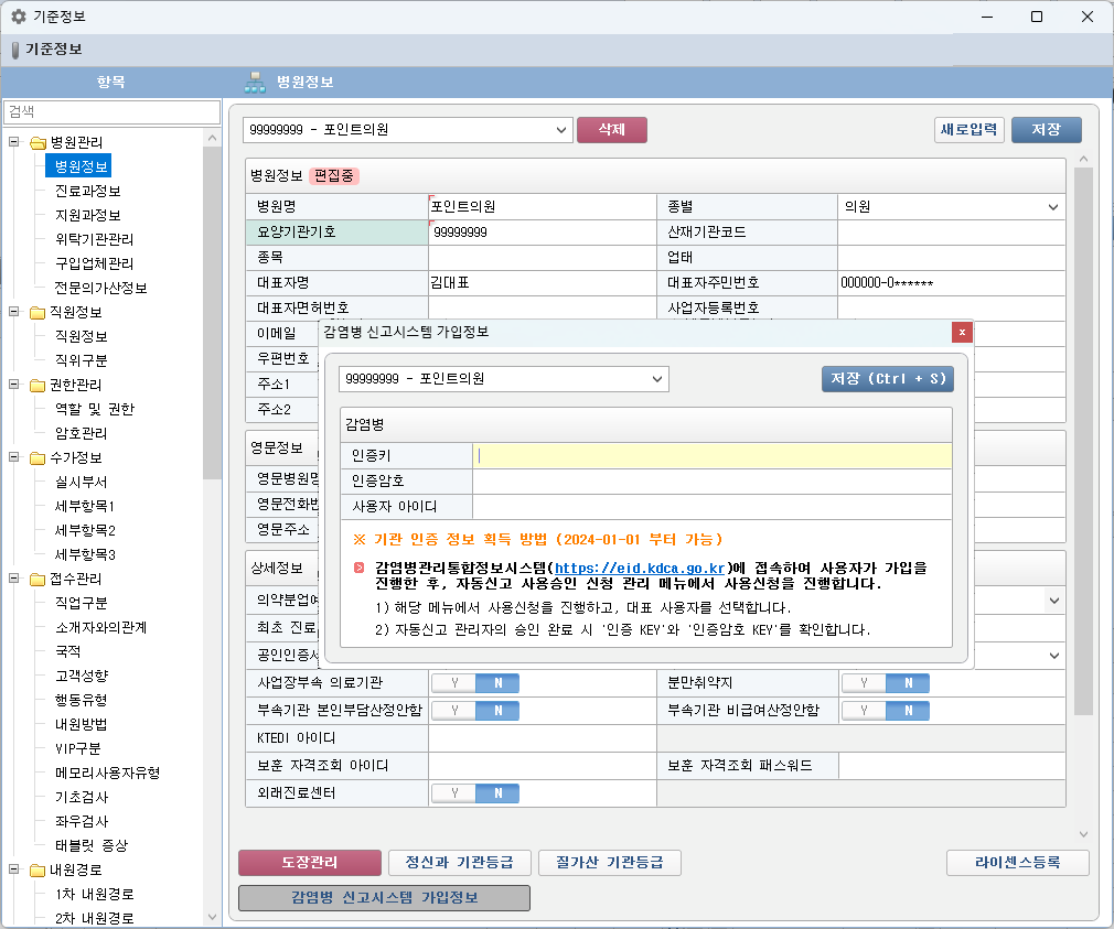 인증키및인증 암호키발급 - 병원 기준 정보에 감염병 신고시스템 가입 정보 등록