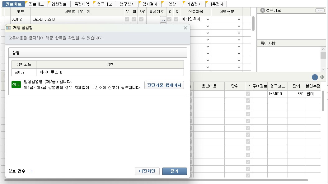 - 감염병 코드 사용 시 차트 점검 창에 정보 표시