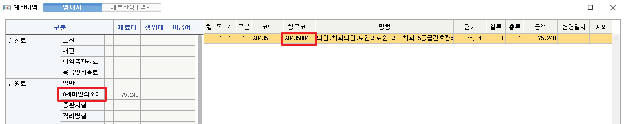- 청구 명세서에서 산정코드 004 확인