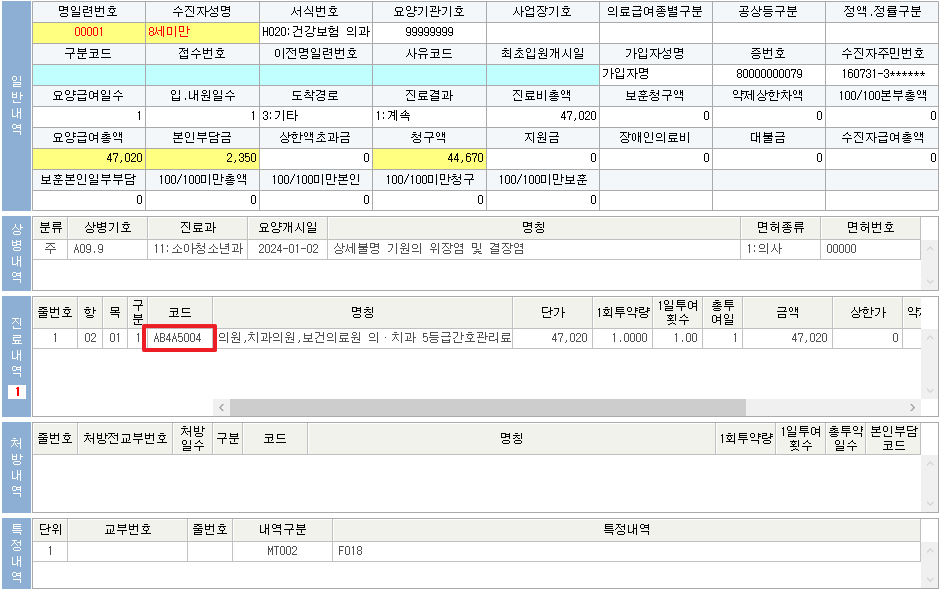 - 청구 명세서에서 산정코드 00A 확인