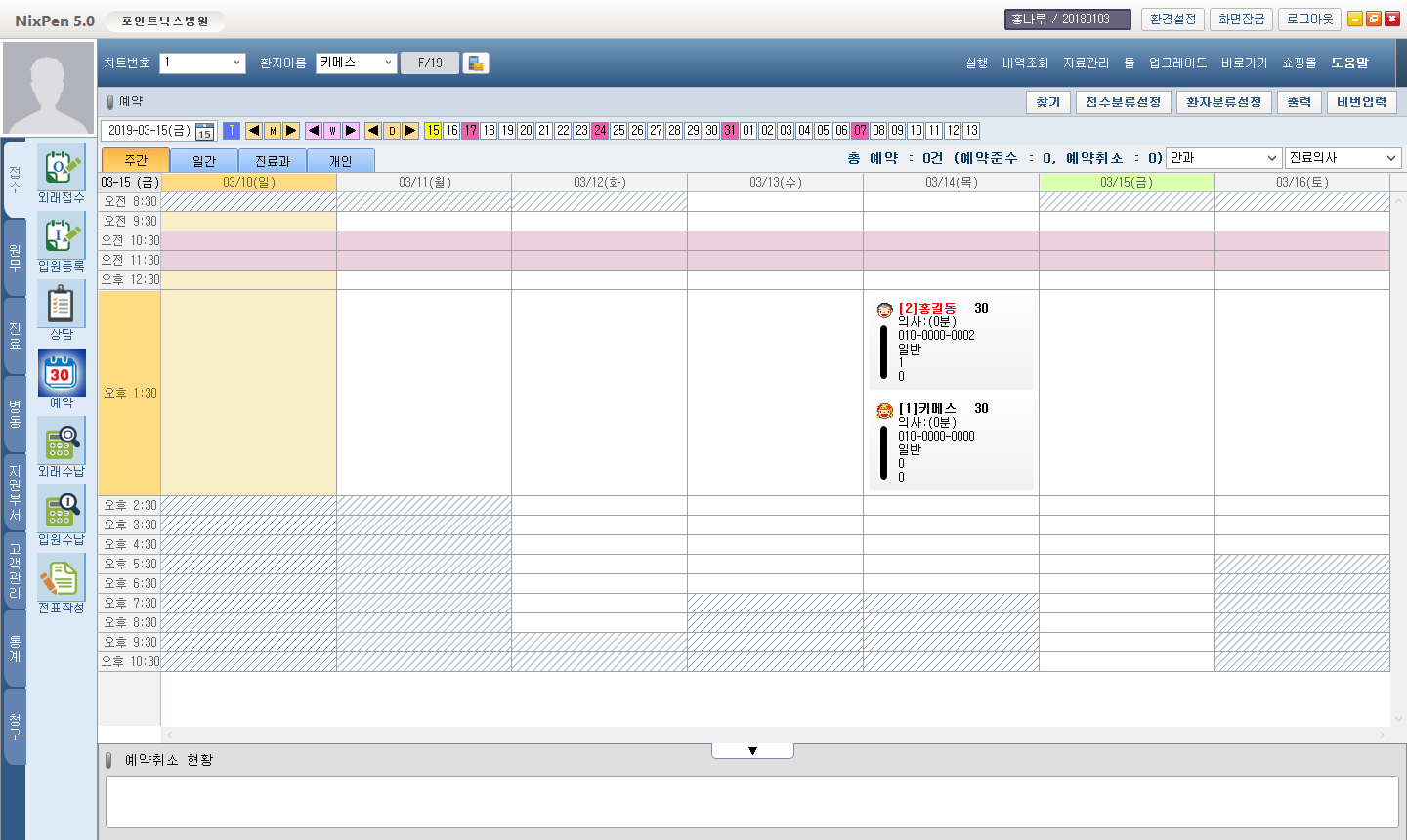 예약 - 주간예약 - 일간예약 - 진료과별 - 개인별(의사별) - 예약취소현황 - 비번(OFF)입력 - 예약현황 출력