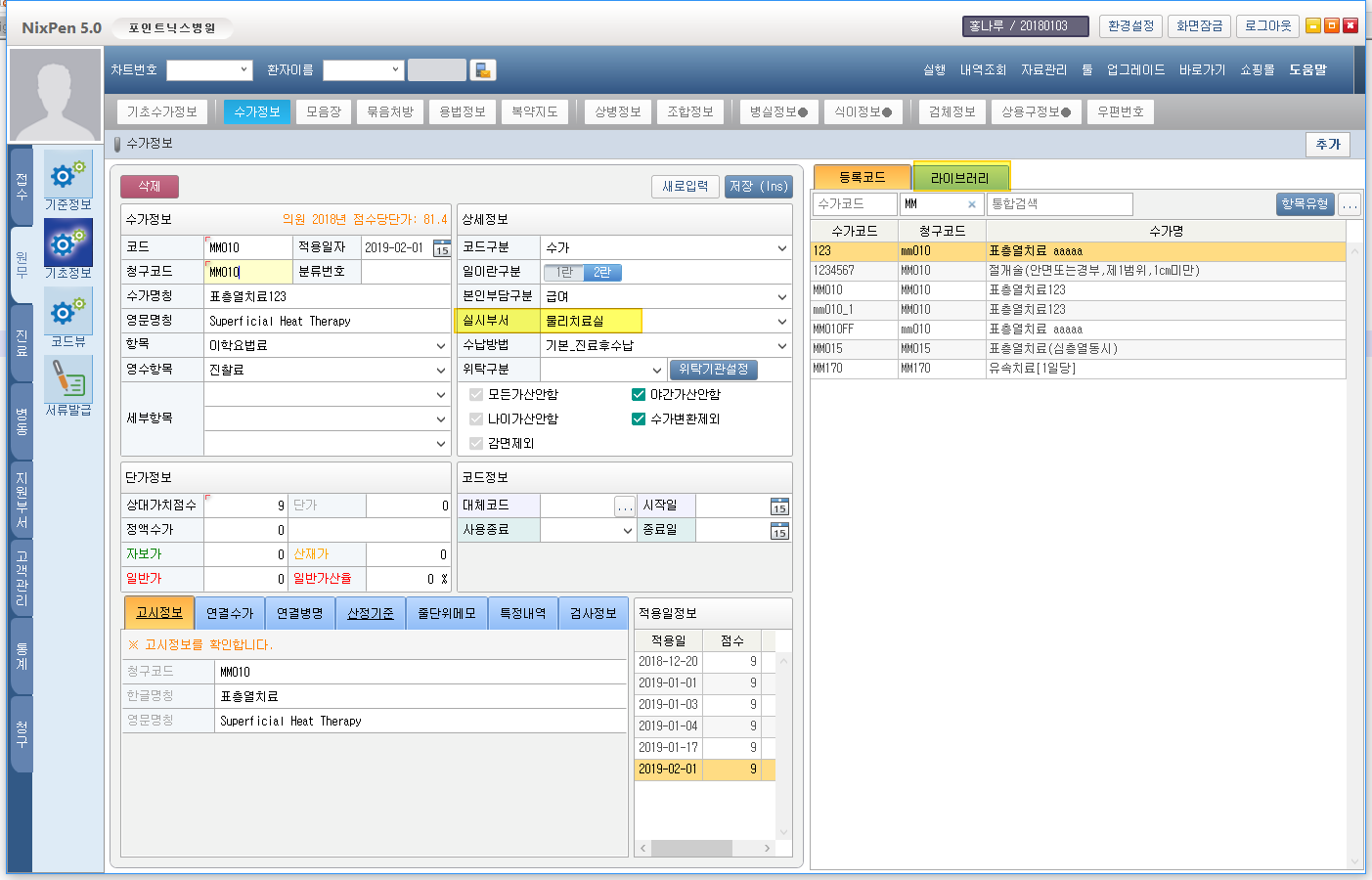 1) 수가/약가/치료재료 별 화면 분리 (화면 단순화) 2) 사용코드와 라이브러리 분리 3) 대체코드 기능 (특정일자부터 다른 코드로 대체 입력) 4) 실시부서 설정 기능