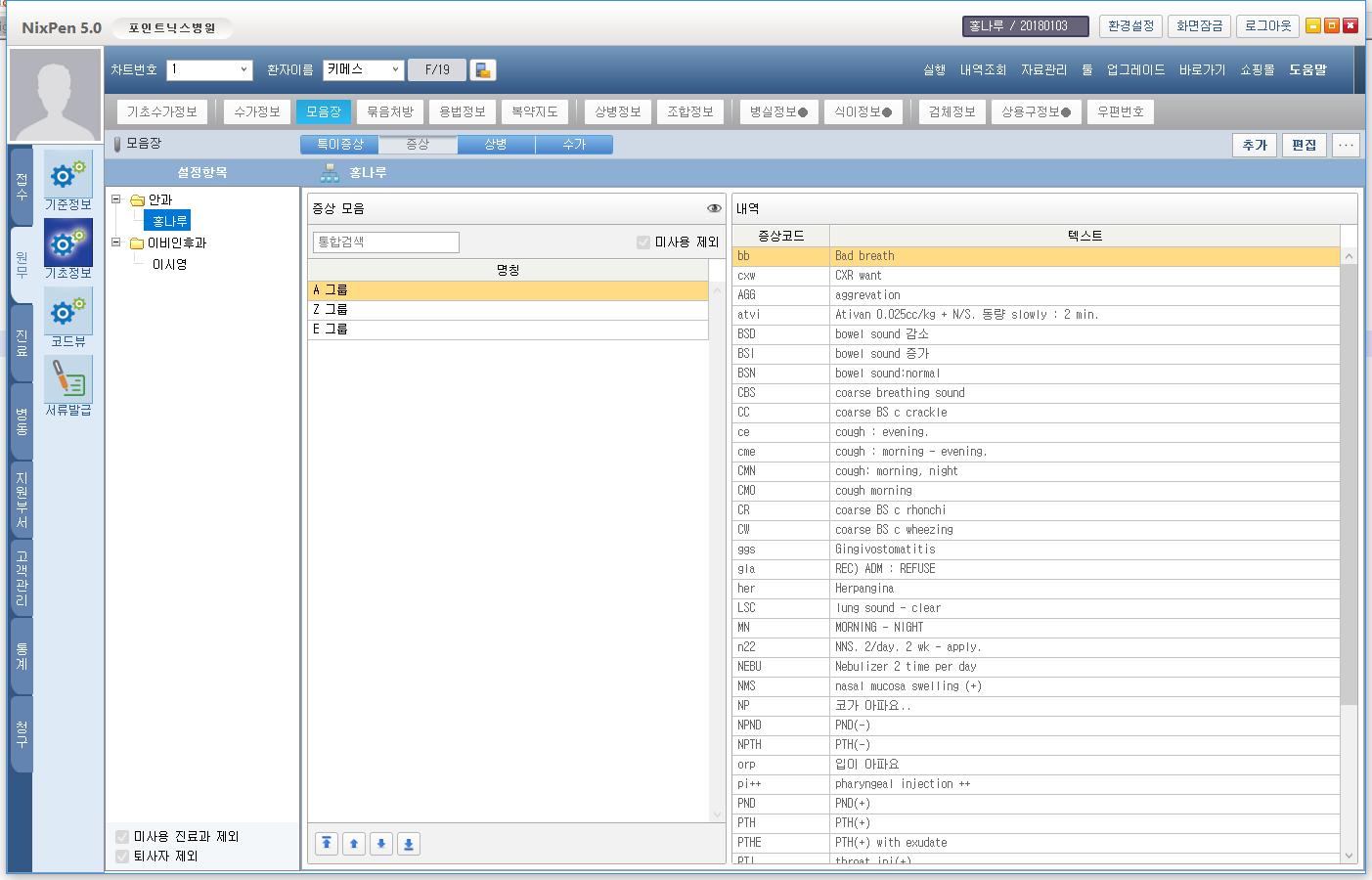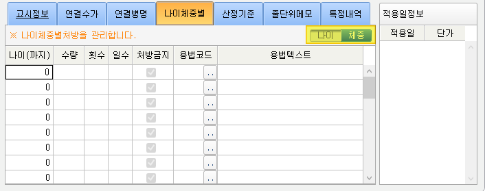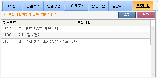 1) 코드별 나이/체중 처방 설정 지원 2) 산정기준 조건 추가 3) 줄단위메모 자동 생성 기능 4) 특정내역 자동 추가 기능