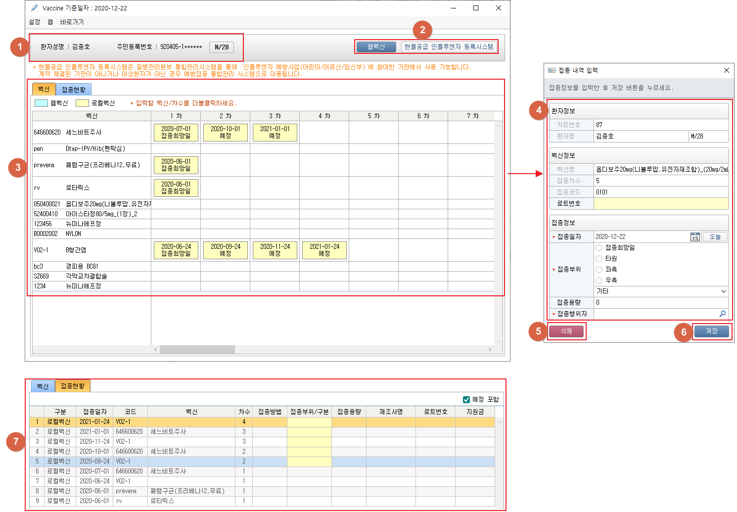 ① [백신] 버튼 클릭 시 백신 창이 팝업됩니다. 환자정보를 확인할 수 있습니다. ② [웹백신], [현물공급 인플루엔자 등록시스템] 버튼 클릭 시 웹페이지로 연결됩니다. 환자 및 백신정보가 전달됩니다. ③ 백신의 접종내역을 확인 및 입력할 수 있습니다. 입력할 백신과 차수에 해당하는 영역을 더블클릭 시 접종 내역 입력 창이 팝업됩니다. ④ 환자정보 및 백신정보를 확인합니다. 항목명이 회색 글씨로 표시되어있는 경우 입력이 불가능한 항목입니다. 붉은 * 표시된 항목은 필수 입력항목입니다. ⑤ [삭제] 버튼 클릭 시 기 입력된 접종내역이 삭제됩니다. ⑥ [저장] 버튼 클릭 시 입력한 접종내역이 저장됩니다. ⑦ 접종현황 탭에서 백신의 접종 현황을 목록 형식으로 확인할 수 있습니다. 10. 백신