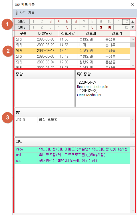 ① [차트] 버튼 클릭 시 차트기록 창이 팝업됩니다. 월력을 확인할 수 있습니다. 진료기록이 있는 달 클릭 시 해당 월의 첫번째 요약기록을 요약기록목록에서 선택합니다. ② 요약기록을 목록으로 표시합니다. 요약기록 선택 시 해당 진료기록을 화면에 표시합니다. ③ 선택된 진료기록이 표시됩니다. 11. 차트