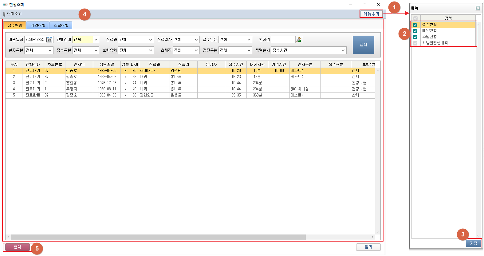 ① [저장] 버튼 클릭 시 환자정보가 저장됩니다. ② [색인] 버튼 클릭 시 환자 선택 창이 팝업됩니다. ③ [예약] 버튼 클릭 시 예약 화면이 창으로 팝업됩니다. ④ [검사실] 버튼 클릭 시 검사실 화면이 창으로 팝업됩니다. ⑤ [물리치료실] 버튼 클릭 시 물리치료실 화면이 창으로 팝업됩니다. ⑥ [방사선실] 버튼 클릭 시 방사선실 화면이 창으로 팝업됩니다. ⑦ [오더] 버튼 클릭 시 오더 창이 팝업됩니다. ⑧ [화면정리] 버튼 클릭 시 조회된 환자가 초기화됩니다. 6. 사용자 버튼