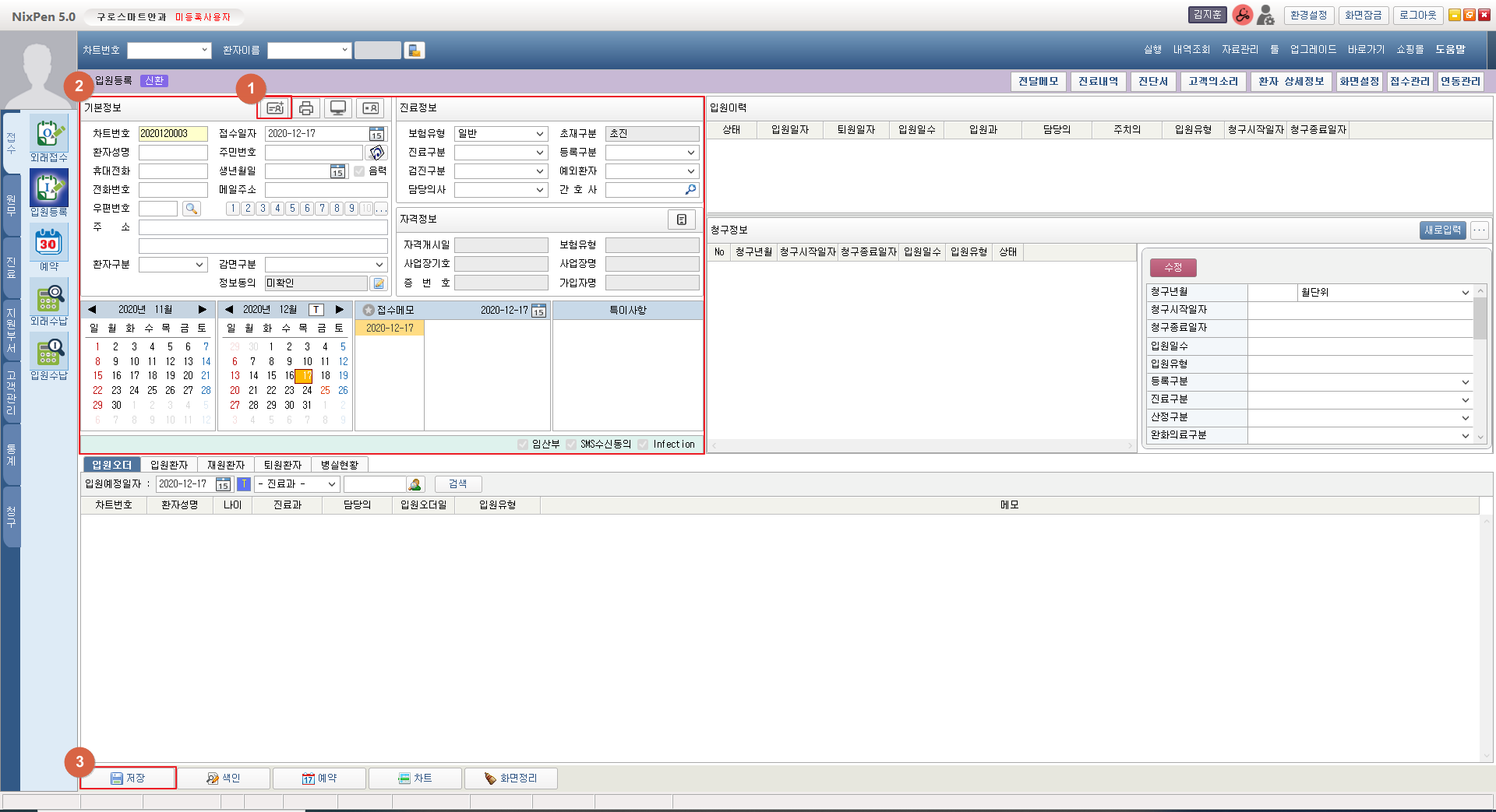 ① [새로입력] 버튼을 클릭하여 신환을 등록할 수 있습니다. 하단의 [화면정리] 버튼을 클릭하거나, 상단 검색바에서 [초기화] 버튼을 클릭하여 화면이 정리 된 경우, 바로 신환 등록 진행이 가능합니다. ② 신환의 기본 정보, 진료 정보, 자격 정보 등을 입력합니다. ③ 하단의 [저장] 버튼을 클릭하거나 단축키를 사용하여 신환을 등록할 수 있습니다. 1. 인적사항 저장