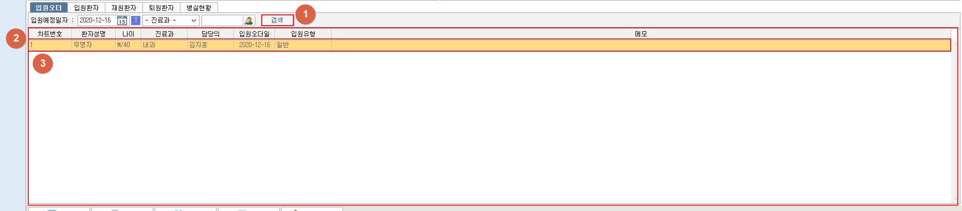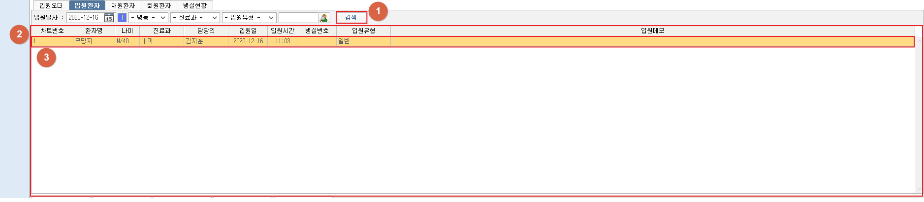 ② 검색 조건에 해당하는 당일 입원환자 목록을 확인할 수 있습니다.