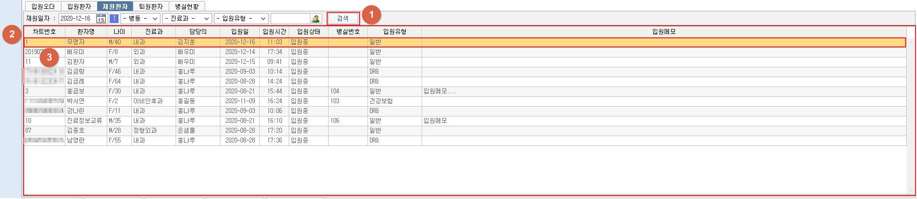 ① 일자, 병동, 진료과 및 의사, 입원유형, 환자 명을 입력한 후 [검색] 버튼을 클릭하여 재원환자를