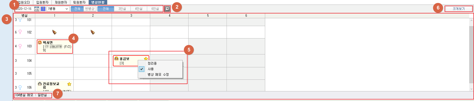 ⑤ 환자정보를 우클릭하여 정리상태, 사용상태를 변경할 수 있고 병실메모를 입력 할 수 있습니다.