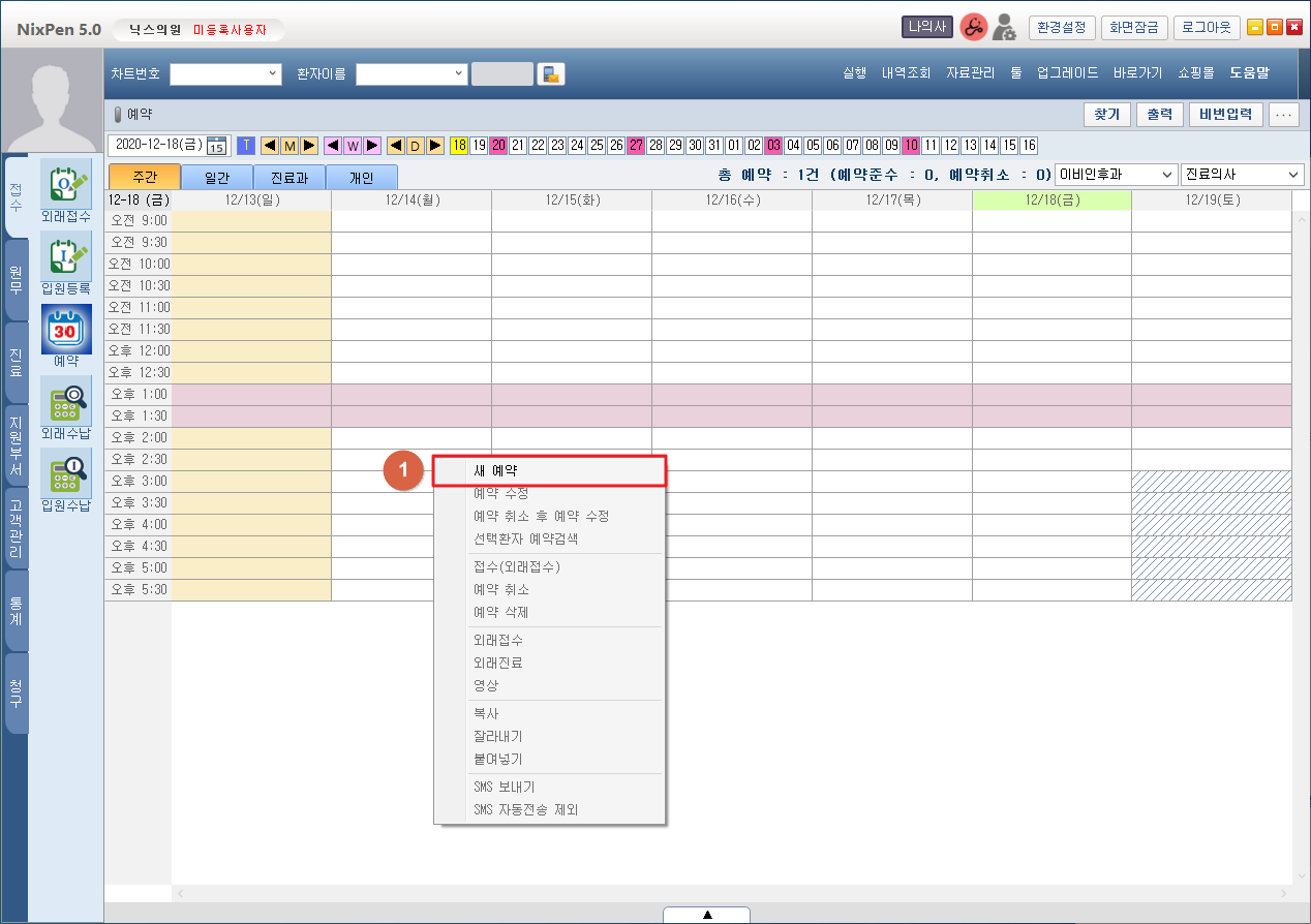 ① 예약을 추가하려는 [시간 테이블] 에 마우스 오른쪽 버튼을 클릭한 후 [새 예약] 메뉴를 클릭합니다. 1. 새 예약