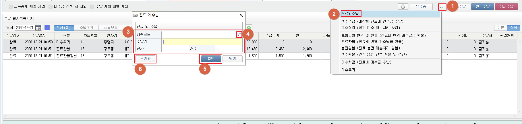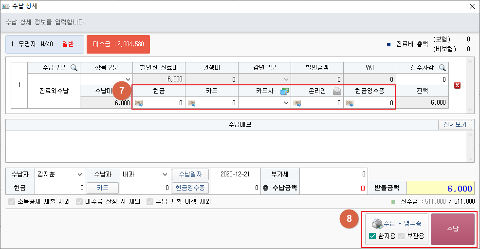 ① [...] 버튼을 클릭합니다. ② [진료외수납] 버튼을 클릭합니다. ③ 대상 항목을 입력합니다. ④ [ 1. 진료외수납 ] 버튼을 클릭하여 상품코드를 선택할 수 있습니다. 상품 등록은 기준정보_수납관리_상품관리에서 할 수 있습니다. ⑤ [확인] 버튼을 클릭합니다. ⑥ [초기화] 버튼을 클릭하여 ③항목을 초기화 할 수 있습니다. ⑦ 대상 금액을 입력합니다. ⑧ [수납+영수증] 버튼을 클릭하면 수납내역을 저장 후 영수증을 출력할 수 있습니다. [수납] 버튼을 클릭하면 수납내역을 저장합니다.