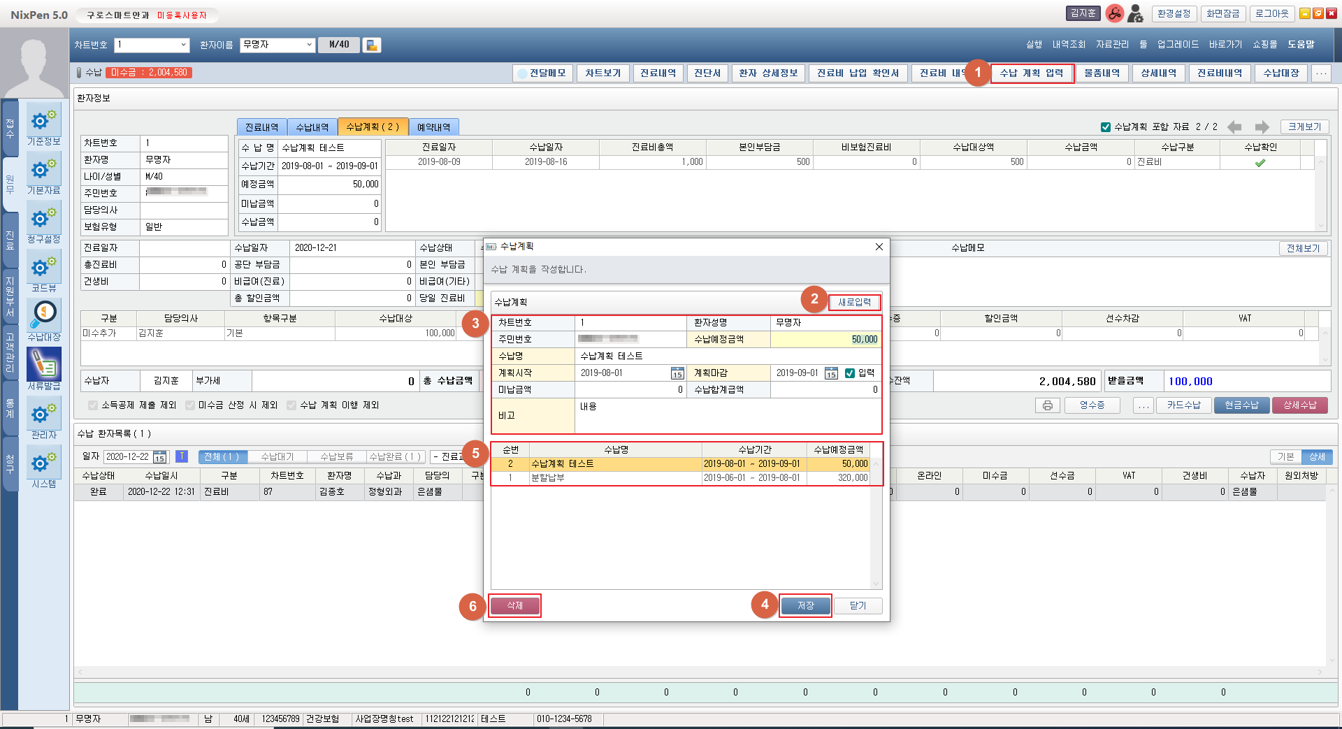 ⑥ ⑤수납계획 목록을 선택 후 [삭제] 버튼을 클릭하여 삭제 할 수있습니다.