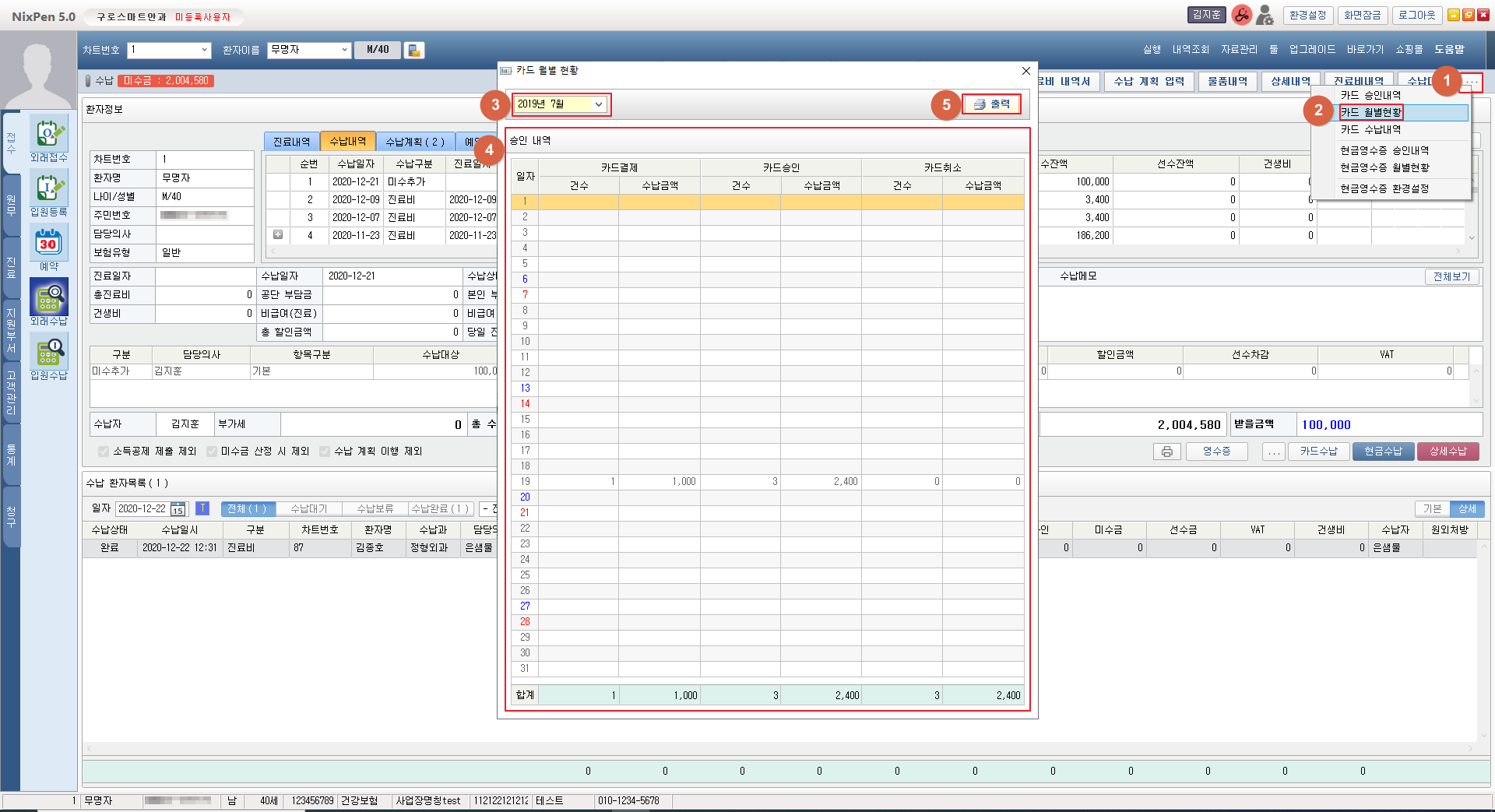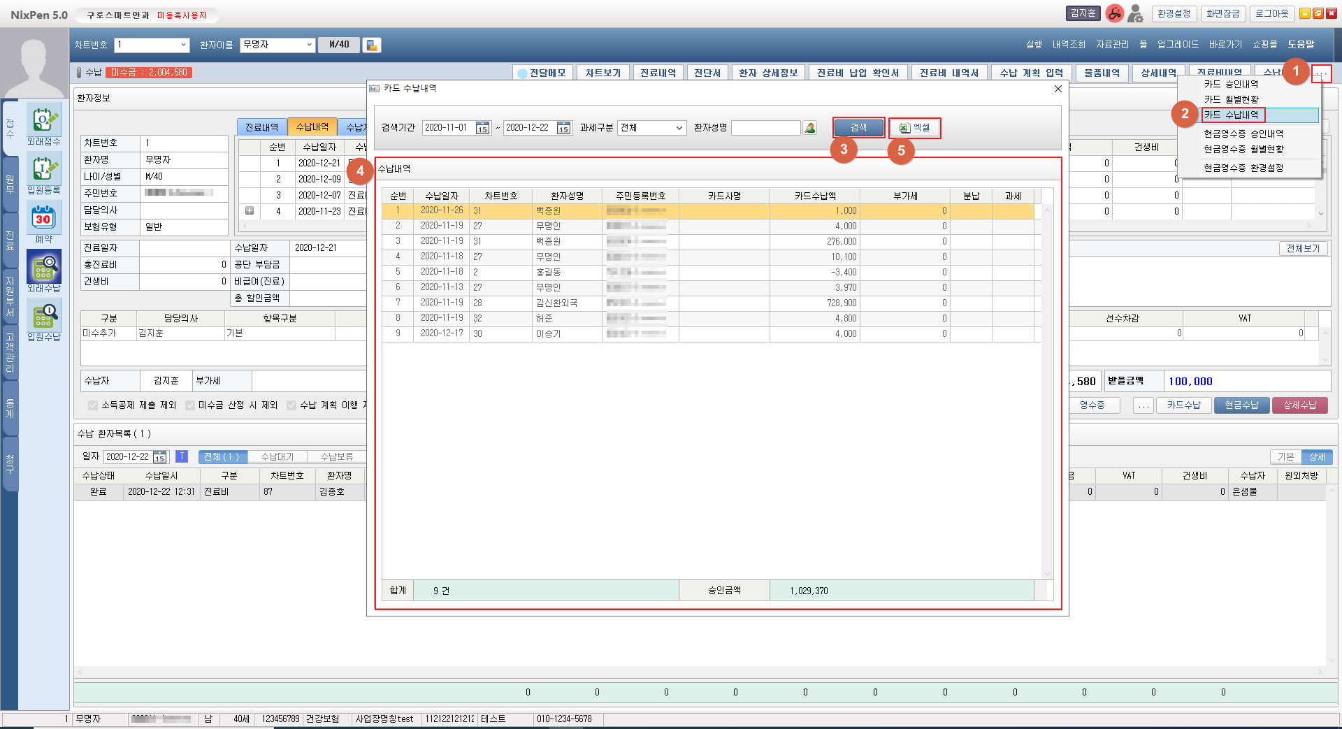 ⑤ 검색한 ④카드수납내역을 엑셀로 다운로드 받을 수 있습니다.