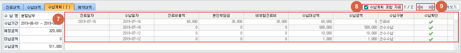 ⑨ 이전/다음 수납계획으로 이동할 수 있습니다.