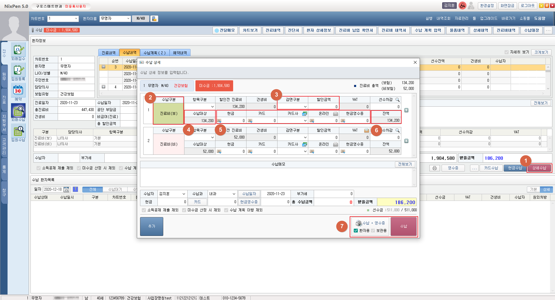 ⑦ [수납+영수증] 버튼을 클릭하면 수납내역을 저장 후 영수증을 출력할 수 있습니다.