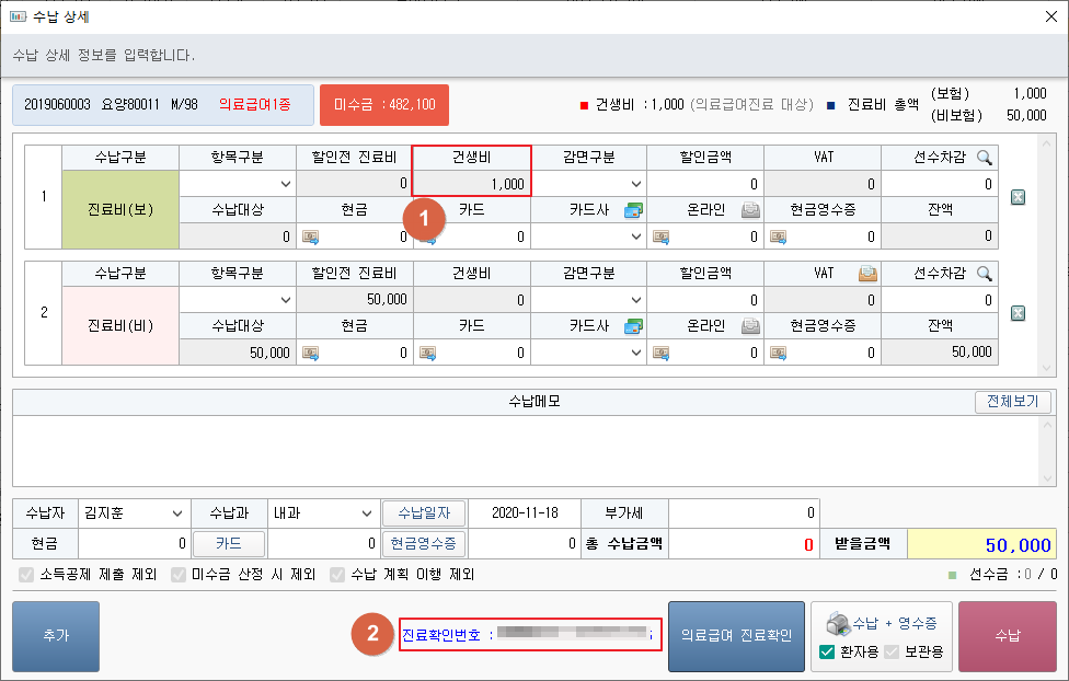 ① 진료 수납일 경우 [수납취소] 버튼을 클릭하면 입력한 내용이 삭제됩니다.