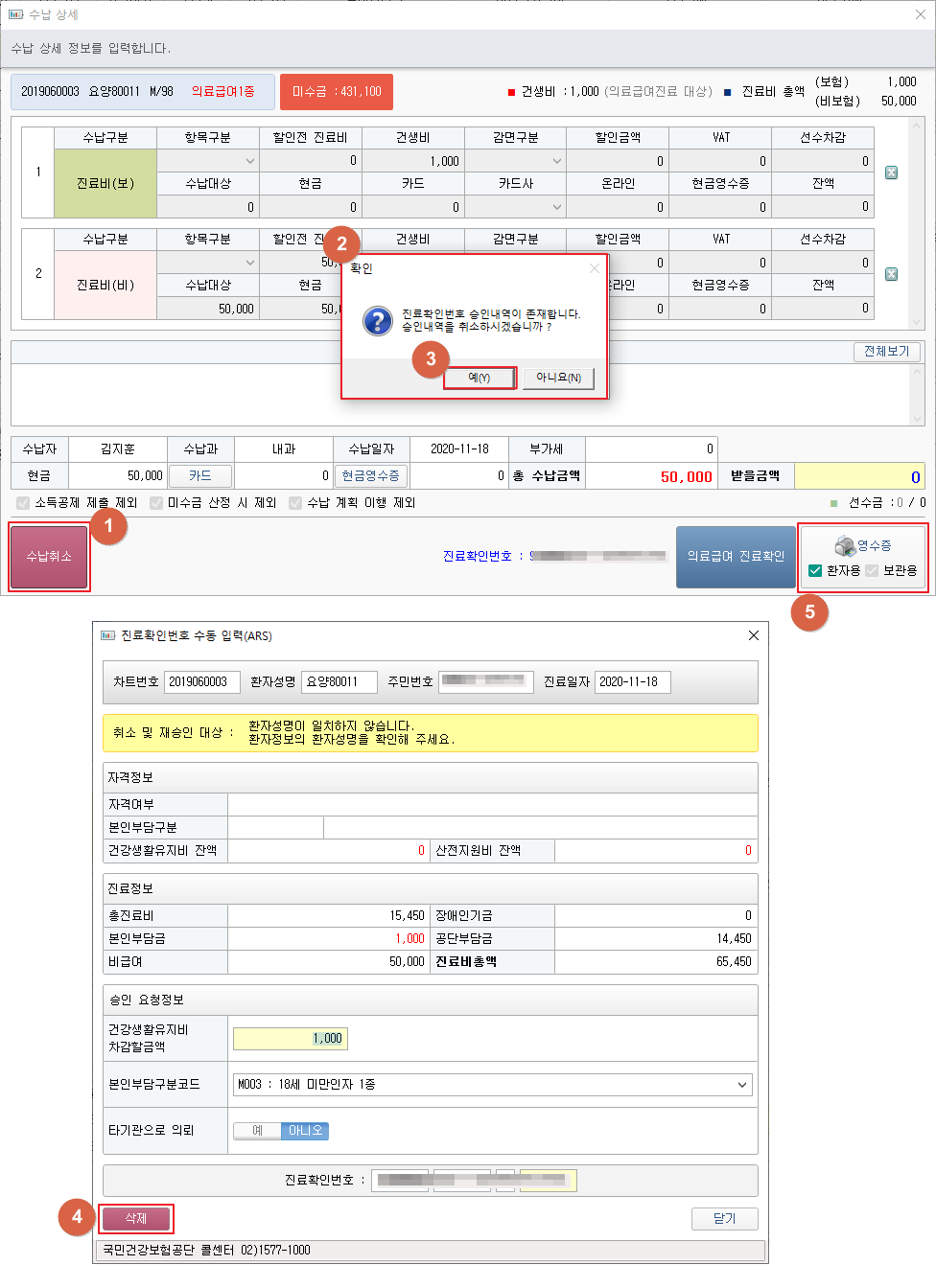 ④ [삭제] 버튼을 클릭하여 진료확인번호 승인 취소 요청을 하고 수납을 삭제합니다.