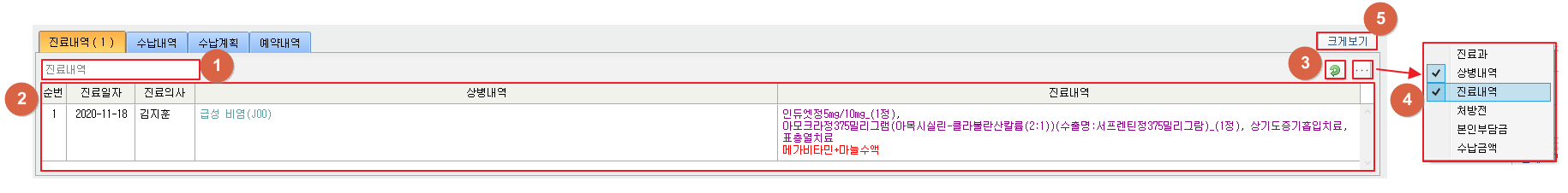 ① 조회 조건을 입력하여 진료내역을 검색합니다. ② 진료내역을을 확인합니다. ③ [ 1. 진료내역 ] 버튼을 클릭하여 새로고침 할 수 있습니다. ④ [...] 버튼을 클릭하여 ②진료내역 항목 표시 여부를 설정할 수 있습니다. ⑤ [크게보기] 버튼을 클릭하여 ②진료내역을 크게 볼 수 있습니다.