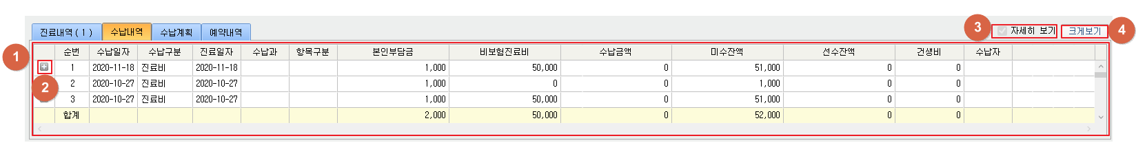 ① 수납내역을 확인합니다. ② [ 2. 수납내역 ] 버튼을 클릭하여 접힘/펼침을 변경할 수 있습니다. ③ [자세히보기] 를 클릭하여 전체 ②접힘상태를 변경할 수 있습니다. ④ [크게보기] 버튼을 클릭하여 ②수납내역을 크게 볼 수 있습니다.