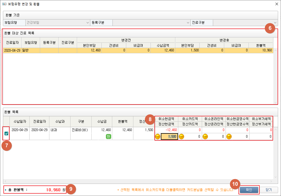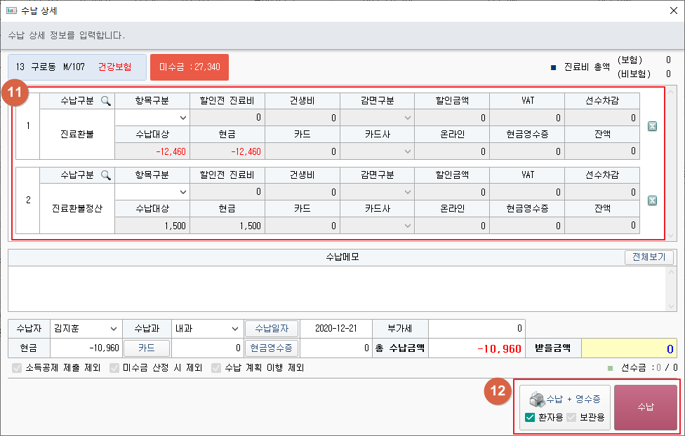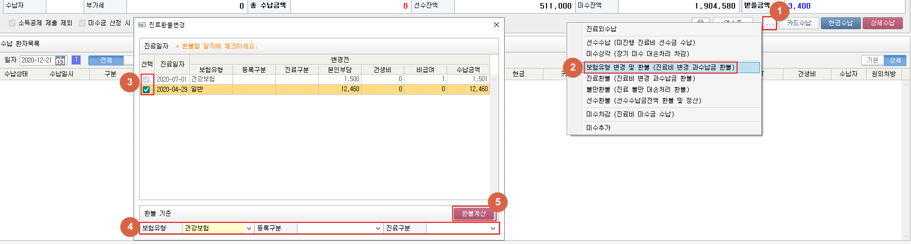 ① [...] 버튼을 클릭합니다. ② 보험유형을 변경하여 수납 처리하고자 할 경우 [보험유형 변경 및 환불(진료비 변경 과수납금 환불)] 버튼을 클릭합니다. ③ 환불할 일자를 선택합니다. ④ 변경할 보험유형, 등록구분, 진료구분을 선택합니다. ⑤ [환불계산] 버튼을 클릭합니다. ⑥ 환불 대상 진료비 변경 내역을 확인합니다. ⑦ 환불 받을 목록을 선택합니다. ⑧ 대상 금액을 각 항목에 입력합니다. ⑨ 총 환불액을 확인합니다. ⑩ [확인] 버튼을 클릭합니다. ⑪ 환불 및 정산 내역을 확인합니다. ⑫ [수납+영수증] 버튼을 클릭하면 수납내역을 저장 후 영수증을 출력할 수 있습니다. [수납] 버튼을 클릭하면 수납내역을 저장합니다. 1. 보험유형 변경 및 환불