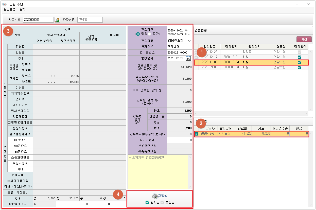 ① 수납 완료된 입원현황을 클릭하여 선택합니다. ② 수납내역을 선택합니다. ③ 영수증 항목을 확인할 수 있습니다. ④ [재발행] 버튼을 클릭하여 영수증을 재발행할 수 있습니다. 2. 발행내역 확인