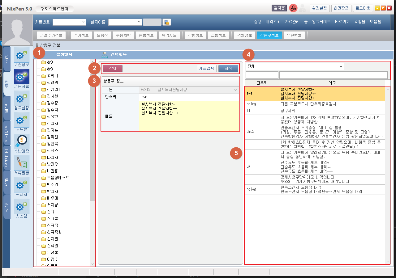 ① 의사목록이 트리로 표시됩니다. 트리를 선택하면 해당의사의 ⑤상용구목록이 표시됩니다. ② [삭제] 버튼 클릭 시 ③상용구정보를 삭제합니다. [새로입력] 버튼 클릭 시 ③상용구정보가 초기화되며 로그인한 직원의 사용구정보로 저장할 준비가 됩니다. [저장] 버튼 클릭 시 ③상용구정보를 저장합니다. ③ 사용구 정보가 표시됩니다. ④ 상용구구분, 단축키, 메모로 상용구를 검색할 수 있습니다. ⑤ 검색된 상용구 목록이 표시됩니다. 목록을 더블클릭하여 ③상용구정보를 확인할 수 있습니다. 1. 상용구정보