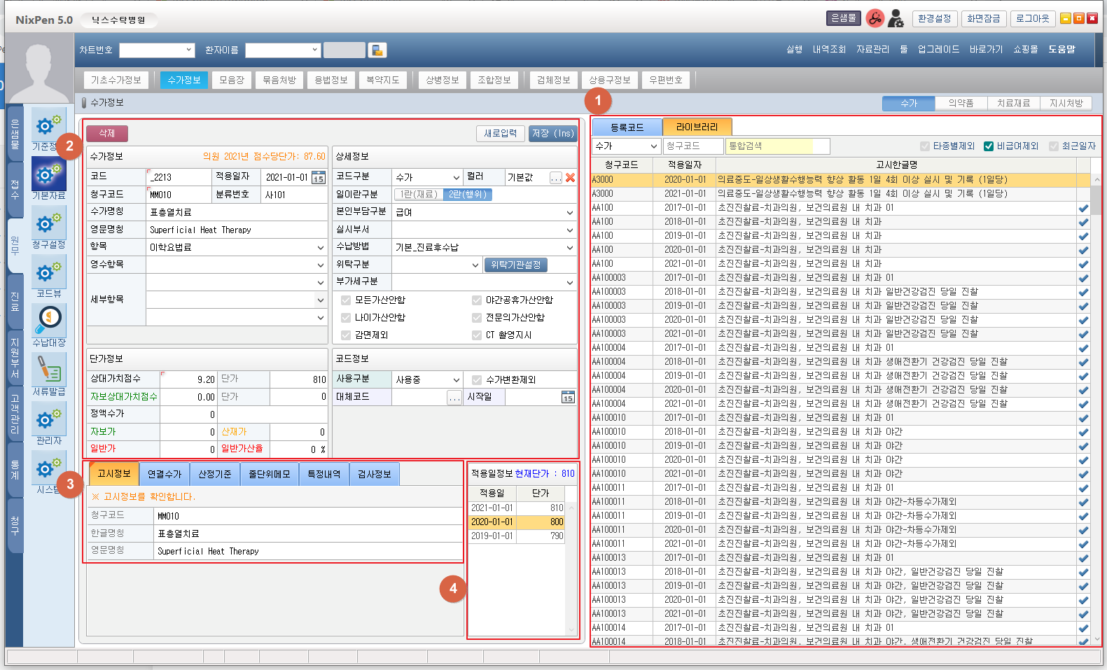 ① 등록코드탭과 라이브러리 탭을 사용할 수 있습니다. ② 선택한 수가정보를 표시합니다. [삭제] 버튼 클릭 시 선택된 수가정보를 삭제할 수 있습니다. [새로입력] 버튼 클릭 시 수가코드를 새로 등록할 수 있습니다. [저장] 버튼 클릭 시 변경사항을 저장합니다. 코드 입력칸에 검색할 코드 입력 후 엔터 시 해당코드를 표시합니다. ③ 탭을 이동하여 선택된 수가의 추가정보를 확인하거나 편집할 수 있습니다. ④ 목록에서 적용일 정보를 더블클릭하여 해당 일자의 수가정보를 확인할 수 있습니다. 1. 수가정보