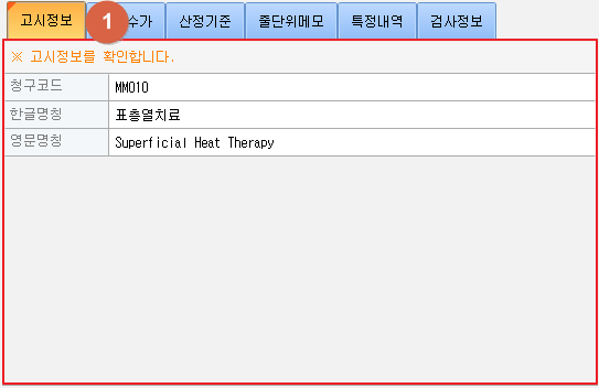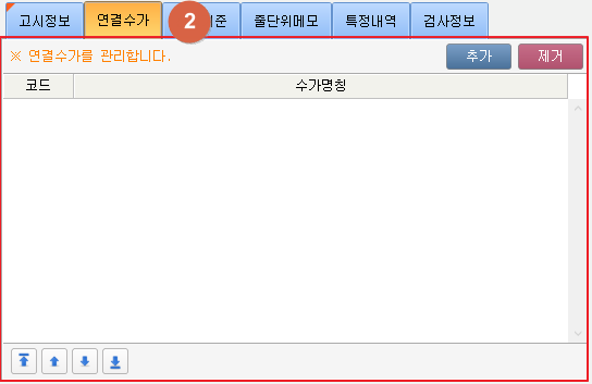① 고시정보를 확인할 수 있습니다. 내용을 변경할 수 없습니다. 2. 추가정보 탭 ② 연결수가 항목이 표시됩니다. [추가] 버튼 클릭 시 약수가 검색 창이 팝업됩니다. [제거] 버튼 클릭 시 목록에서 선택된 연결수가를 제거합니다. 우측하단의 순서변경 버튼을 사용하여 순서를 변경할 수 있습니다.