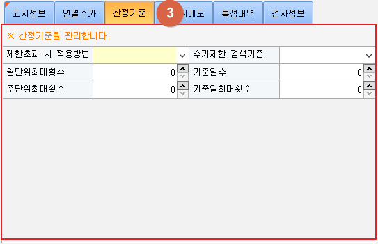③ 산정기준을 관리할 수 있습니다. 각 최대횟수와 기준일수는 최대 500까지 입력할 수 있습니다.
