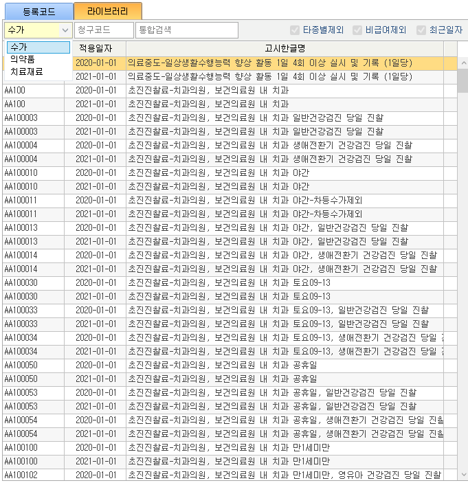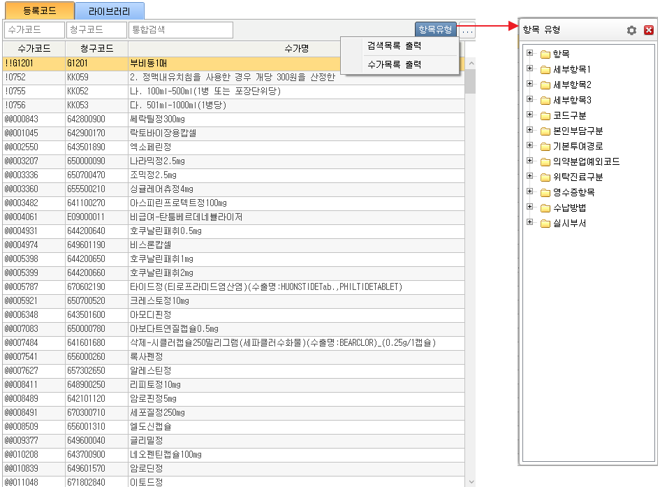 ① 등록된 코드 목록이 표시됩니다. 수가코드, 청구코드, 통합검색란에 검색어 입력 후 엔터 시 검색결과가 목록에 표시됩니다. 수가코드, 청구코드는 일치검색입니다. 항목유형버튼 클릭 시 슬라이드 되는 창에서 항목을 선택하여 목록 검색할 수 있습니다. [...] 버튼 클릭 시 목록 출력할 수 있습니다. 3. 등록코드 / 라이브러리 탭 ② 라이브러리에 있는 코드 목록이 표시됩니다. 콤보박스를 선택하여 검색할 수 있습니다. 청구코드, 통합검색란에 검색어 입력 후 엔터 시 검색결과가 목록에 표시됩니다. 청구코드는 일치검색입니다. 각 체크박스를 체크/체크해제 하여 검색할 수 있습니다.