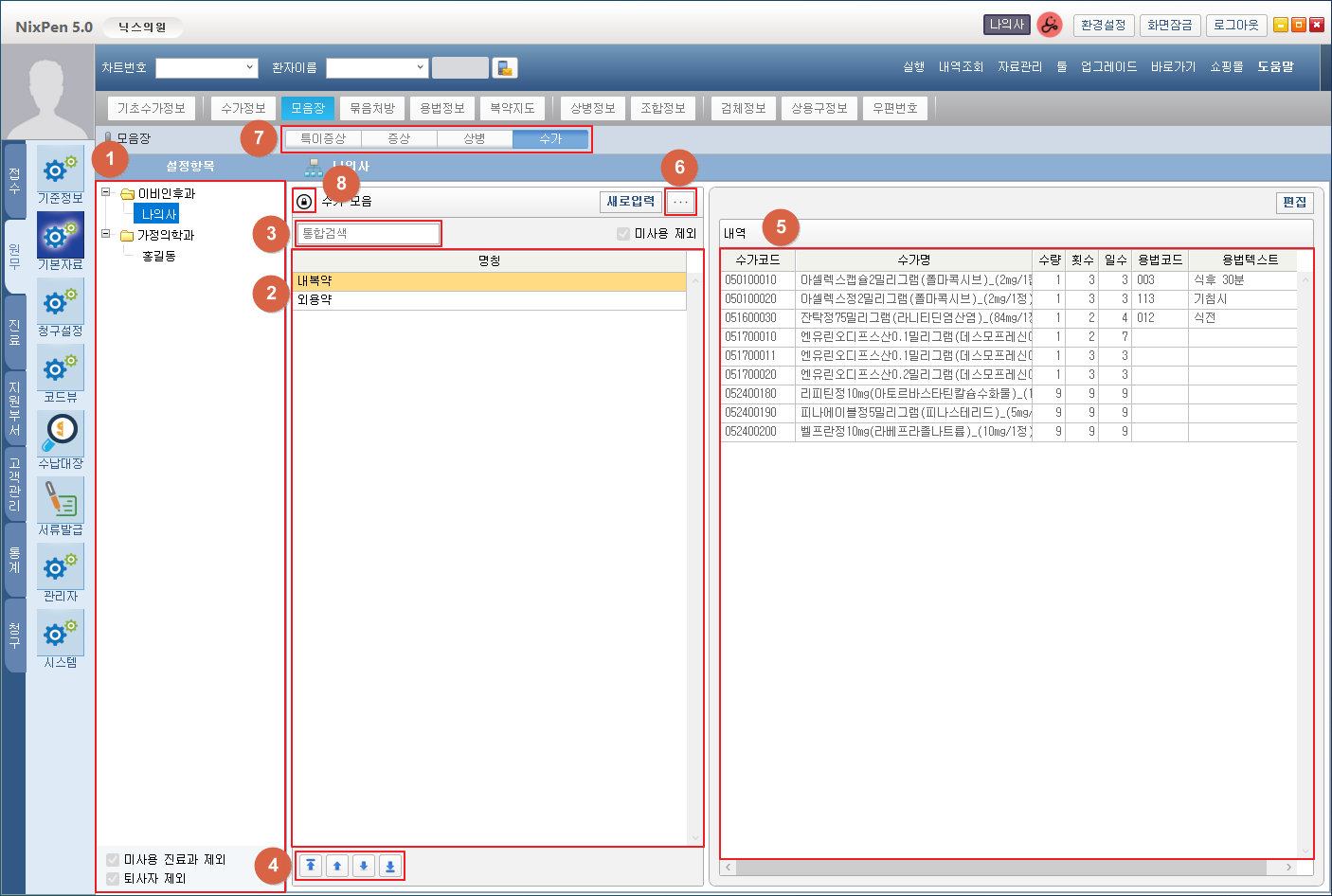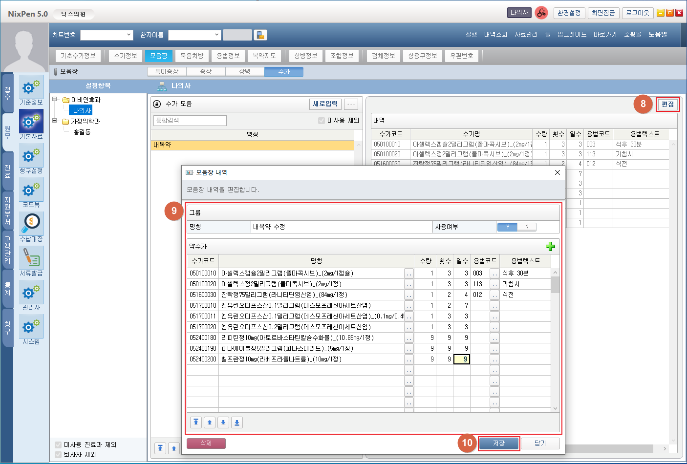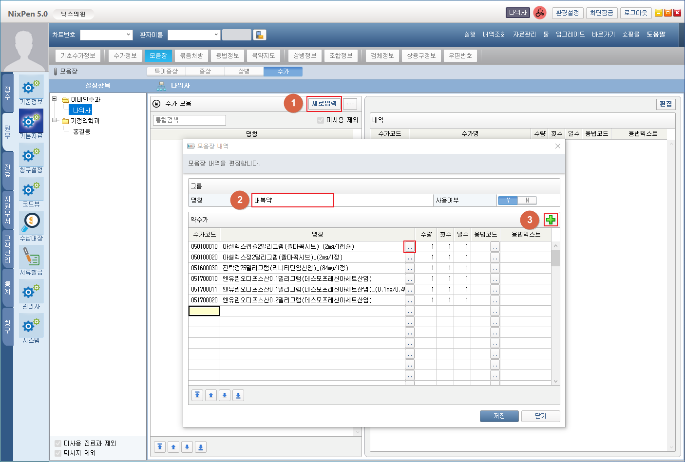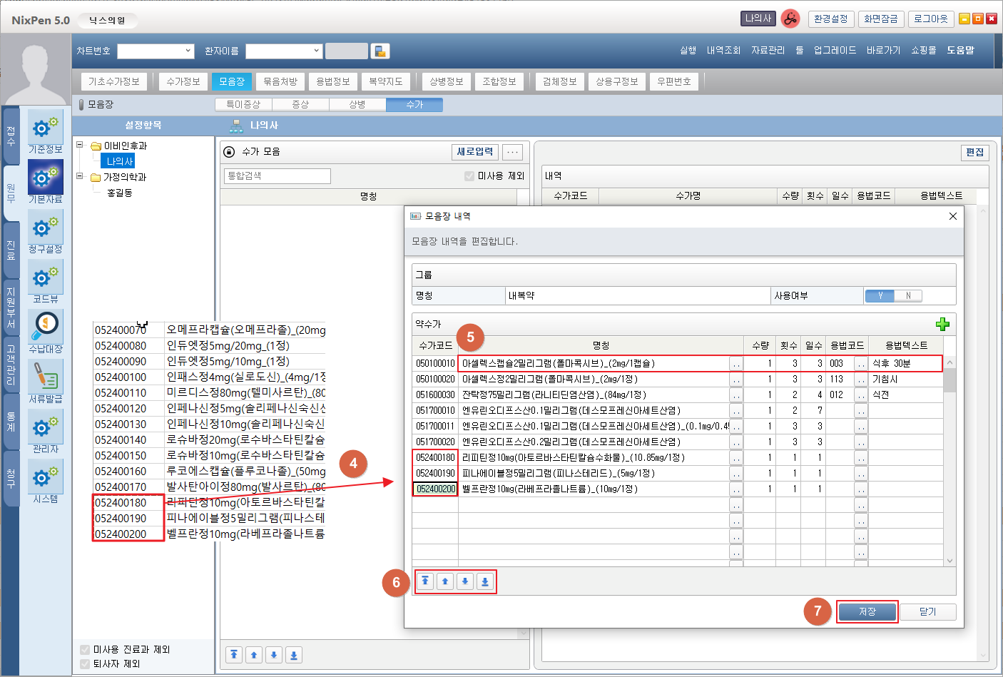 ⑤ 수가명칭, 용법, 수량, 횟수, 일수를 편집합니다.